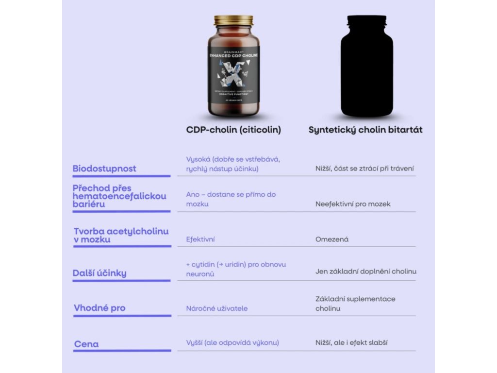 Prebuď svoj mozog na plné obrátky! BrainMax Enhanced Citicholine obsahuje CDP-cholín vo forme Witspower™, ktorý je získavaný šetrnou cestou z prírodných zdrojov. V kombinácii s acetyl-L-karnitínom a extraktom z ginkgo biloby podporuje pamäť, koncentráciu a krvný obeh v mozgu. CDP-cholín sa v tele premieňa na cholín a cytidín, ktoré sú nevyhnutné pre tvorbu neurotransmiterov a fosfatidylcholínu – stavebného prvku bunkových membrán. Ideálny pre študentov, podnikateľov, aktívnych ľudí aj seniorov.