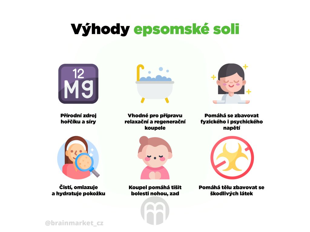 Epsomská soľ je zlúčenina horčíka a síranu. Horčík je pre organizmus veľmi dôležitý, znižuje zápaly, pomáha funkciu svalov a nervov a pomáha produkovať hormón zodpovedný za pocit šťastia. serotonín. Sírany sú tiež veľmi podstatné, zlepšujú vstrebávanie živín do tela a naopak pomáhajú vyplavovať toxíny a zmierňujú migrény.