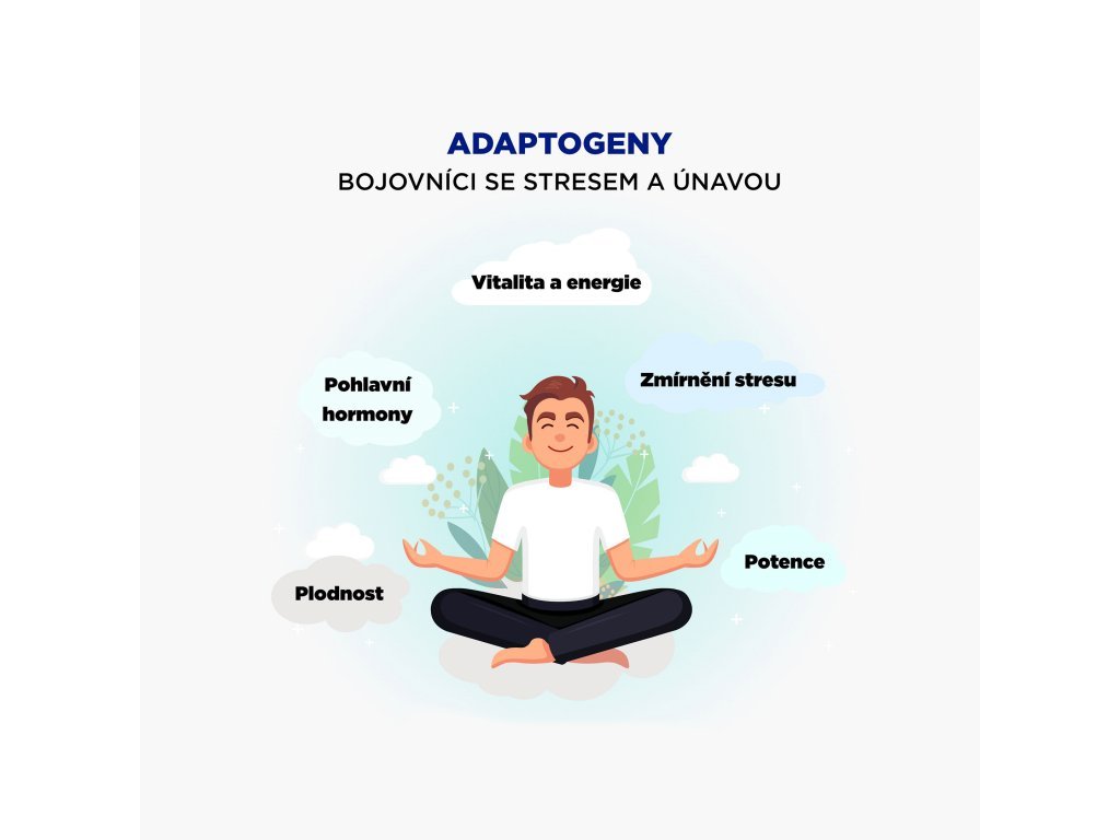 Adaptogény sú skupinou rastlín, ktoré tisíce rokov prekonávali nehostinné stresové podmienky pre život, na ktoré sa boli schopné adaptovať. Možno aj vďaka tomu nám dnes adaptogény pomáhajú zmierniť stres tým, že kontrolujú množstvo uvoľnených stresových hormónov v období stresu. Komplex obsahuje extrakty z najúčinnejších adaptogénov na čele ashwagandhou, ktorú dopĺňa pravý ženšen a shilajit.