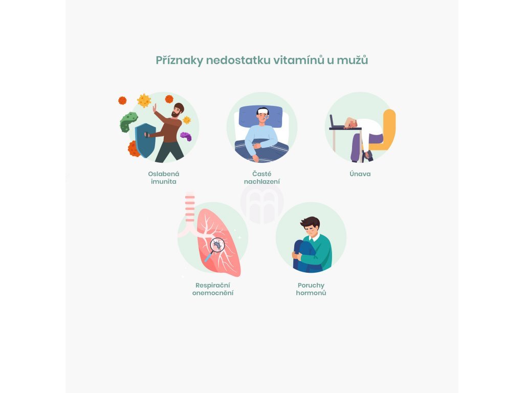Vitamíny a minerály sú mikronutrienty, ktoré majú vplyv nielen na imunitu, ale aj na energiu a celkovú vitalitu. V prípade nedostatku vitamínov u mužov sa môžete stretnúť s oslabenou imunitou, častým prechladnutím a respiračnými ochoreniami , ale aj nedostatkom niektorých hormónov a poruchami hormonálneho rázu. Multivitamín je určený pre mužov všetkých vekových kategórií. Zvýšenú potrebu týchto prvkov potrebujú muži s vysokým pracovným nasadením, stresom, mužmi s fyzicky aj psychicky náročným štýlom života a oslabenou imunitou alebo problémami s plodnosťou.