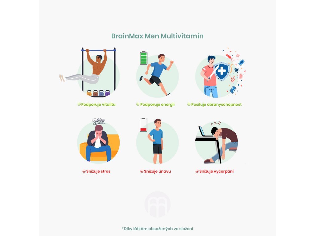 Predstavte si imunitný systém ako štít, ktorý vás nonstop chráni pred útokmi baktérií, vírusov a parazitov. Každý deň sa doslova brodíme morom patogénov a bez funkčného imunitného systému by sme boli pre baktérie, vírusy a parazity veľmi ľahkou korisťou. Pre silnejší imunitný systém je potrebných niekoľko vitamínov, ktoré si telo nevie vytvoriť. BrainMax Men Multivitamín obsahuje najdôležitejšie vitamíny, minerály a stopové prvky, ktoré sa priamo podieľajú na silnejšej imunite a celkovej obranyschopnosti organizmu, vitalite a zdraví reprodukčného systému.