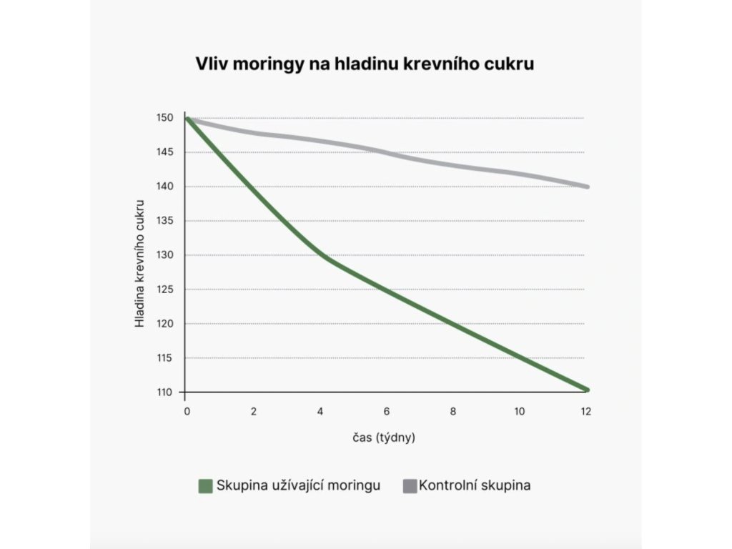 Aktívne zložky obsiahnuté v moringových listoch, ako sú izotiokyanáty a flavonoidy, majú významný vplyv na metabolizmus glukózy. Tieto zložky zvyšujú citlivosť na inzulín a podporujú efektívnejšie využitie glukózy v bunkách, čo vedie k zníženiu hladiny cukru v krvi. Graf znázorňuje zmenu hladiny krvného cukru v oboch skupinách počas 12 týždňov. Zelená krivka predstavuje skupinu užívajúcu moringu a šedá krivka kontrolnú skupinu. Z grafu je zrejmé, že skupina užívajúca moringu má výraznejší pokles hladiny krvného cukru. 1
