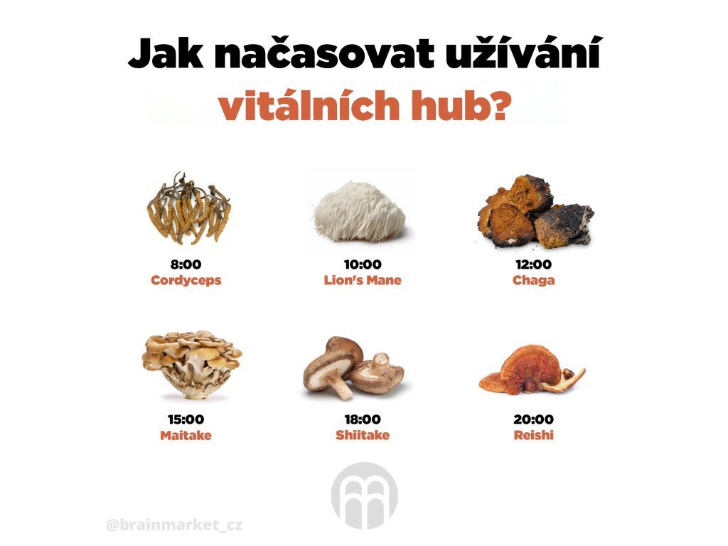 - Pri užívaní vitálnych húb odporúčame zvýšiť príjem vitamínu C, ktorý zvyšuje vstrebateľnosť účinných látok. Napríklad vo forme BrainMax Pure Camu Camu.