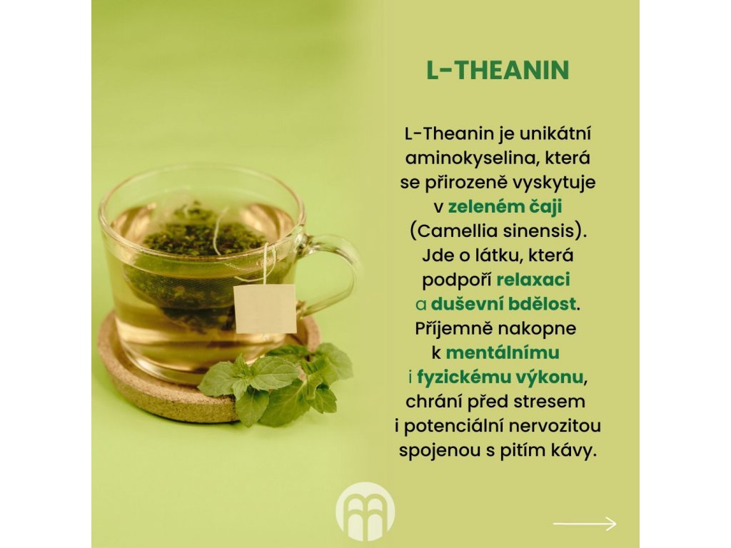 L-Theanín je jedinečná aminokyselina, ktorá sa prirodzene vyskytuje v zelenom čaji (Camellia sinensis). Ide o látku, ktorá podporí relaxáciu a duševnú bdelosť. Príjemne nakopne k mentálnemu aj fyzickému výkonu , chráni pred stresom aj potenciálnou nervozitou spojenou s pitím kávy. Je vhodným pomocníkom ako počas stresujúcich situácií v priebehu dňa, tak aj na upokojenie pred spaním. Ide o látku, ktorá podporí duševnú činnosť, koncentráciu a je vhodná pre tých, ktorí potrebujú zacieliť na koncentráciu bez pocitov ospalosti či nervozity.