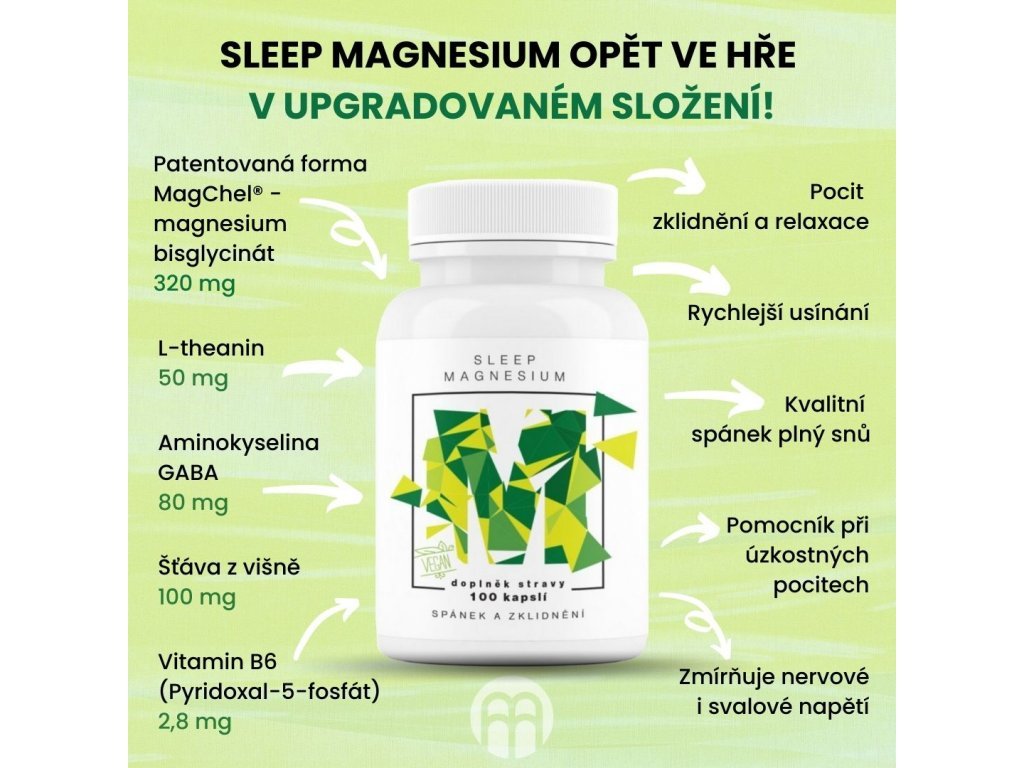 Sleep magnézium je komplex látok s upokojujúcimi účinkami, pomáha regenerácii svalov a podporuje duševný pokoj. Je vhodný pre všetkých, ktorí sa stretávajú s akútnym či chronickým stresom alebo pre tých, ktorých trápia dlhé zaspávanie, prebúdzanie v priebehu noci a zlý spánok.