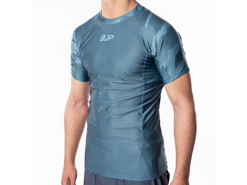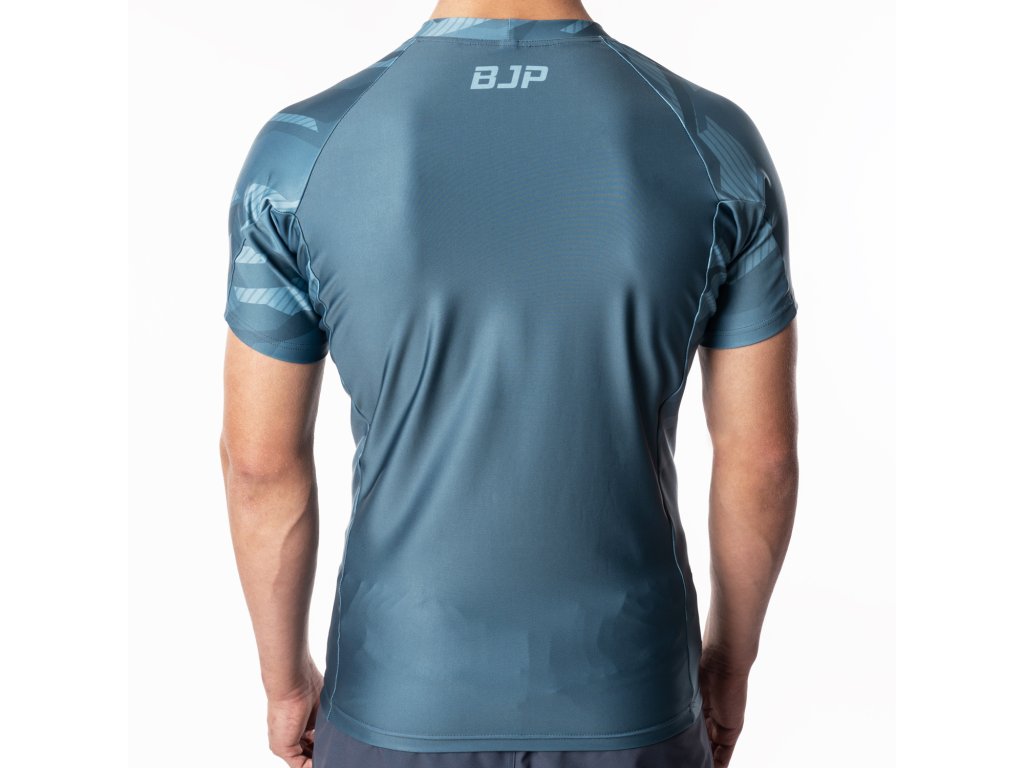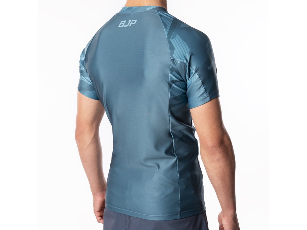 Rashguard má úzky, priliehavý strih s okrúhlym výstrihom a raglánovými rukávmi. Tvarovaný bočný diel prechádza do rukávov bez švov v oblasti podpazušia a zaisťuje tam maximálnu flexibilitu a rozsah pohybu.